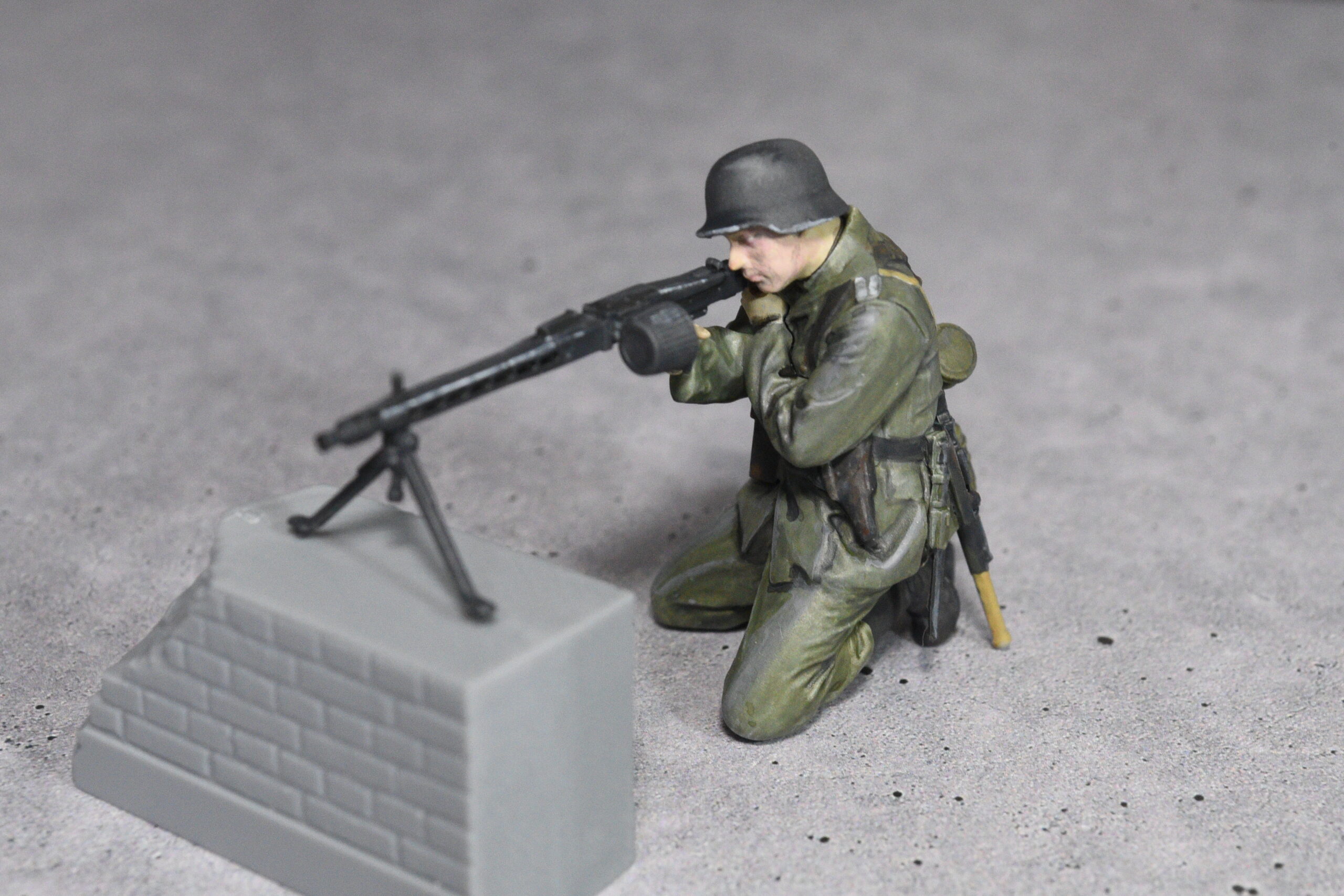 自然なポージング: 3Dスキャンに基づいているため、MG42を構える兵士の肩のラインや、弾帯を持つ手の角度が驚くほど自然。
